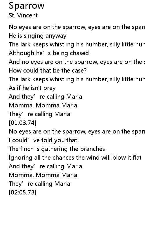 | [00:11.06] | No eyes are on the sparrow, eyes are on the sparrow |