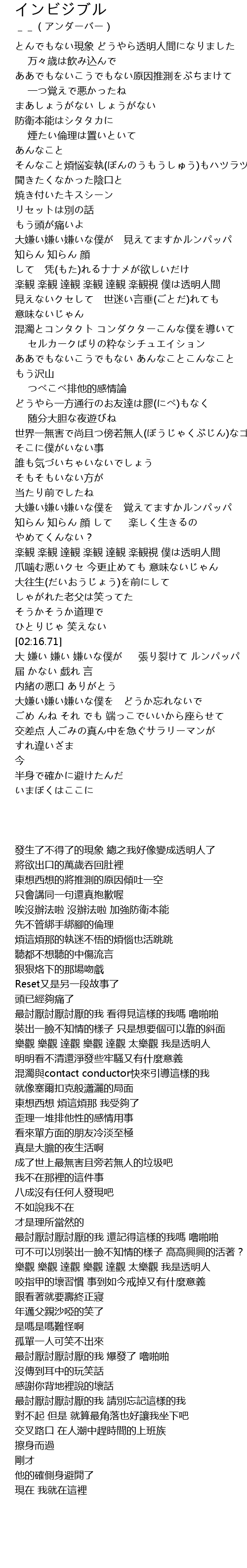 | [01:56.52] | 楽観 楽観 達観 楽観 達観 楽観視 僕は透明人間 |
