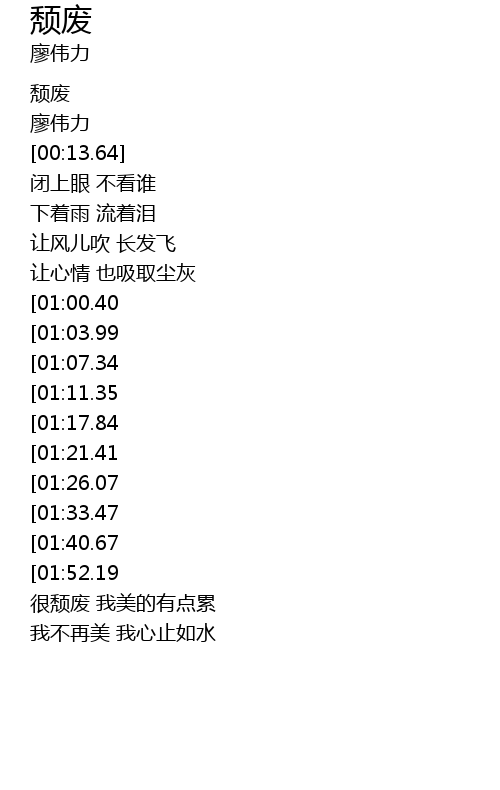 | [02:49.18][01:33.47] | 爱很颓废 我也有点颓废 |