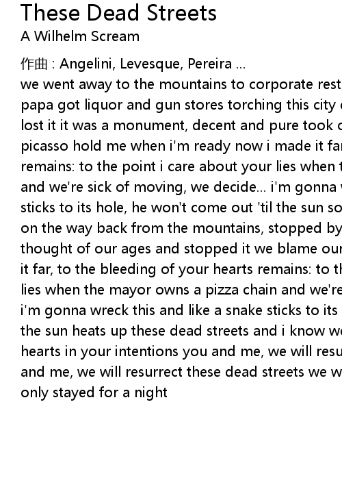 | we went away to the mountains to corporate restaurants, corporate food mama and papa got liquor and gun stores torching this city down i had a thought and i lost it it was a monument, decent and pure took out a razor and made my own picasso hold me when i' m ready now i made it far, to the bleeding of your hearts remains: to the point i care about your lies when the mayor owns a pizza chain and we' re sick of moving, we decide... i' m gonna wreck this and like a snake sticks to its hole, he won' t come out ' til the sun soaks up these dead streets on the way back from the mountains, stopped by the cemetery, drank to our youth thought of our ages and stopped it we blame our diets on changes in mood we made it far, to the bleeding of your hearts remains: to the point i care about your lies when the mayor owns a pizza chain and we' re sick of moving, we decide... i' m gonna wreck this and like a snake sticks to its hole, i won' t come out ' til the sun heats up these dead streets and i know we' re gonna make it because your hearts in your intentions you and me, we will resurrect these dead streets you and me, we will resurrect these dead streets we went away to the mountains we only stayed for a night |