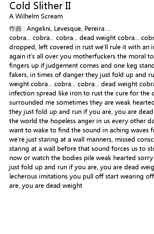 | cobra... cobra... cobra... dead weight cobra... cobra... cobra... the world gets dropped, left covered in rust we' ll rule it with an iron fist behind a drum beat again it' s all over you motherfuckers the moral to story is shit to a rug two fingers up if judgement comes and one keg stand for satan weak hearted sorry fakers, in times of danger they just fold up and run if you are, you are dead weight cobra... cobra... cobra... dead weight cobra... cobra... cobra... infection spread like iron to rust the cure for the disease like chain links surrounded me sometimes they are weak hearted sorry fakers, in times of danger they just fold up and run if you are, you are dead weight and we might just show the world the hopeless anger in us every other day is just more time to kill we want to wake to find the sound in aching waves from our hearts nevertheless, we' re just staring at a wall manners, missed conscience! where are you now left staring at a wall before that sound forces us to stop, drop, and run, hear me now or watch the bodies pile weak hearted sorry fakers, in times of danger they just fold up and run if you are, you are dead weight when all the monumentous lecherous imitations you pull off start wearing off to show what you are if you are, you are dead weight |