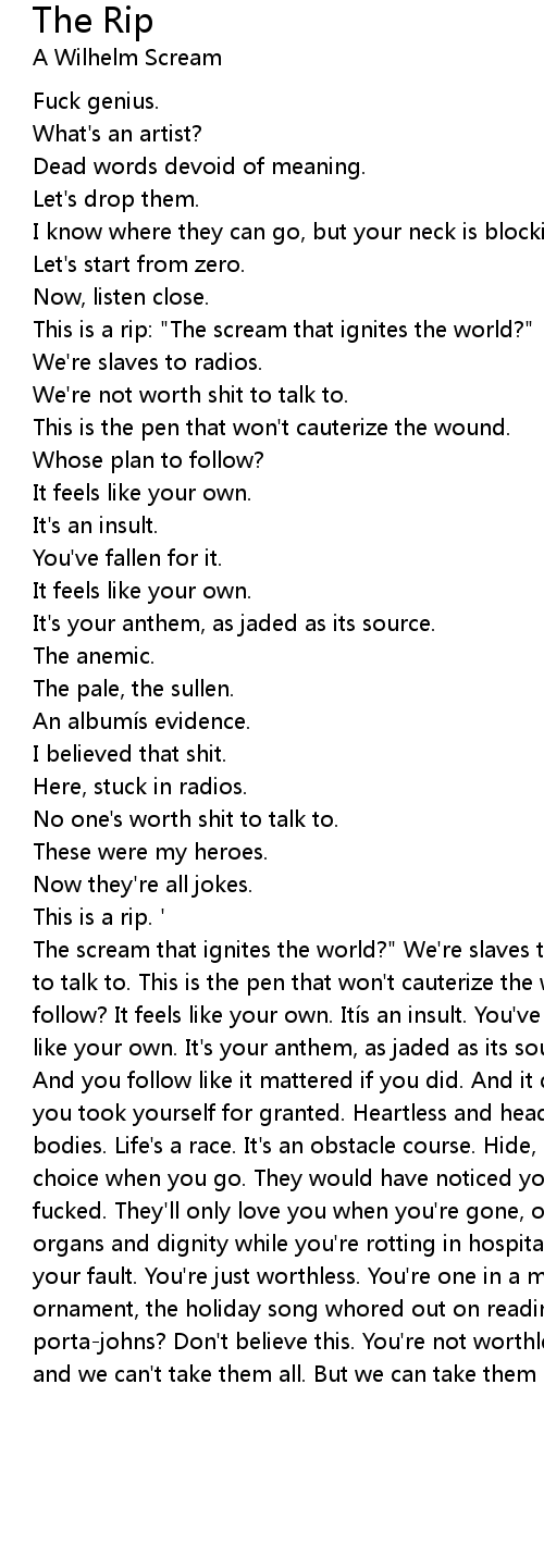 | The scream that ignites the world?" We' re slaves to radios. We' re not worth shit to talk to. This is the pen that won' t cauterize the wound. Whose plan to follow? It feels like your own. Ití s an insult. You' ve fallen for it. It feels like your own. It' s your anthem, as jaded as its source. The ceiling is waiting. And you follow like it mattered if you did. And it dropped you on your head cuz you took yourself for granted. Heartless and headstrong. Jump right over the bodies. Life' s a race. It' s an obstacle course. Hide, but you' ll never have a choice when you go. They would have noticed you if they had known, but you' re fucked. They' ll only love you when you' re gone, or barely hanging on to all your organs and dignity while you' re rotting in hospitals. Don' t believe it? It' s not your fault. You' re just worthless. You' re one in a million. Where í s god? The ornament, the holiday song whored out on reading materials in latrines and portajohns? Don' t believe this. You' re not worthless. It' s us against millions and we can' t take them all. But we can take them on. |