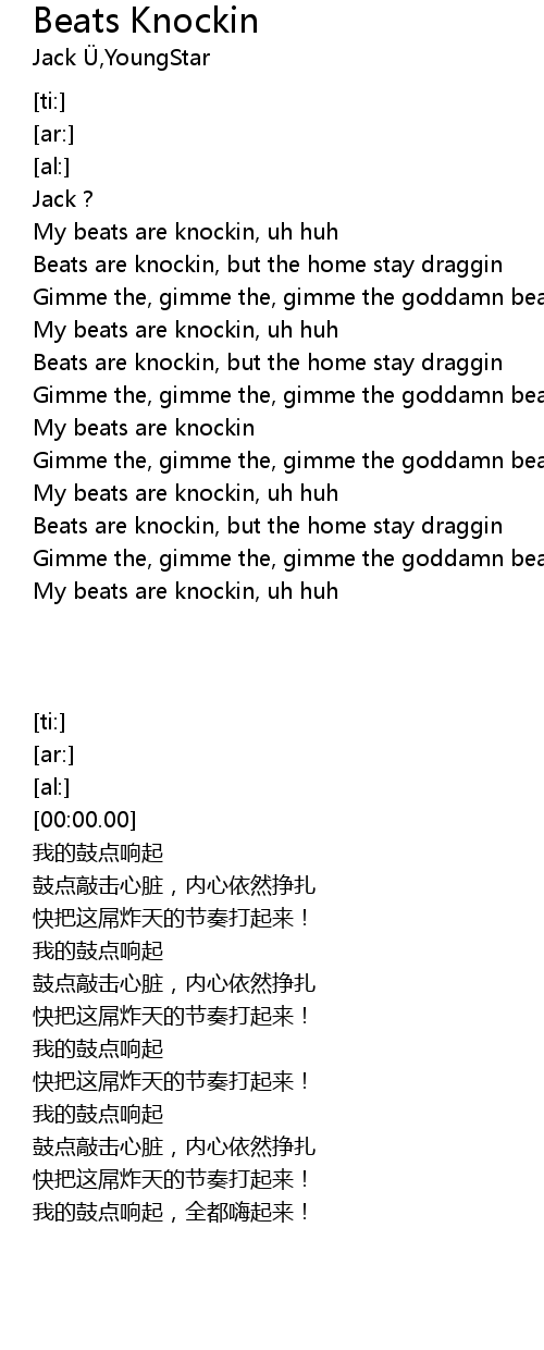 | [01:48.65] | Gimme the, gimme the, gimme the goddamn beat. Beats are knockin |