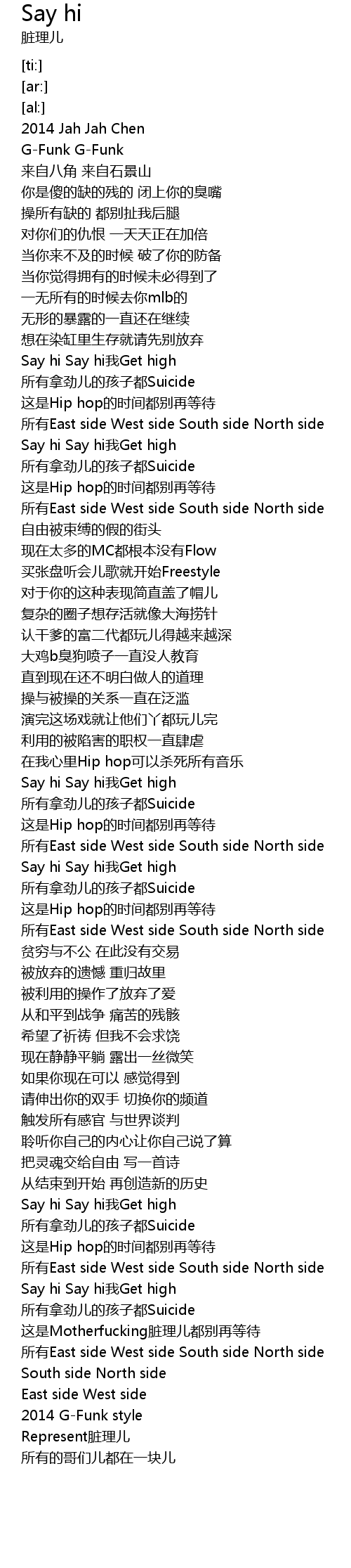 | [01:34.73] | Say hi Say hi wǒ Get high |