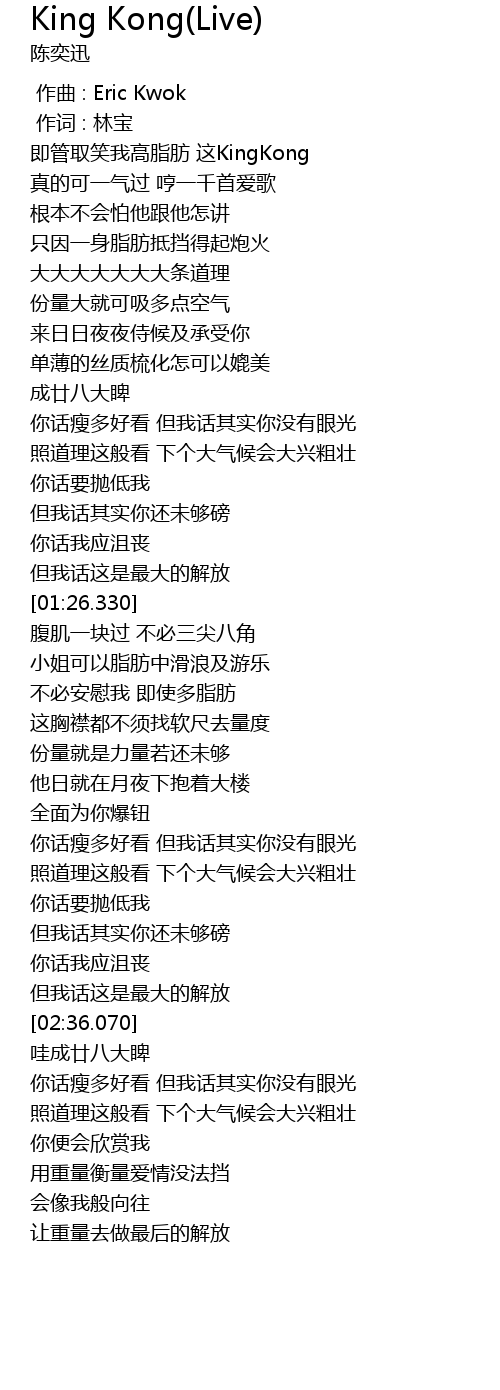| [00:23.070] | 即管取笑我高脂肪 这KingKong |