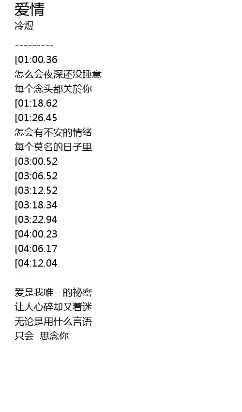 | [02:18.54][04:12.04] | ài nǐ ài nǐ ài zhe nǐ |