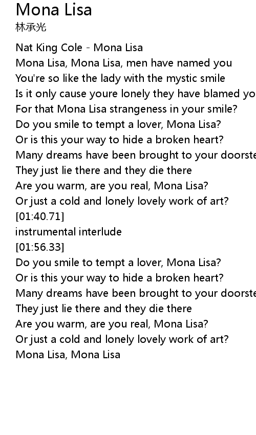 | [01:21.13] | Are you warm, are you real, Mona Lisa? |