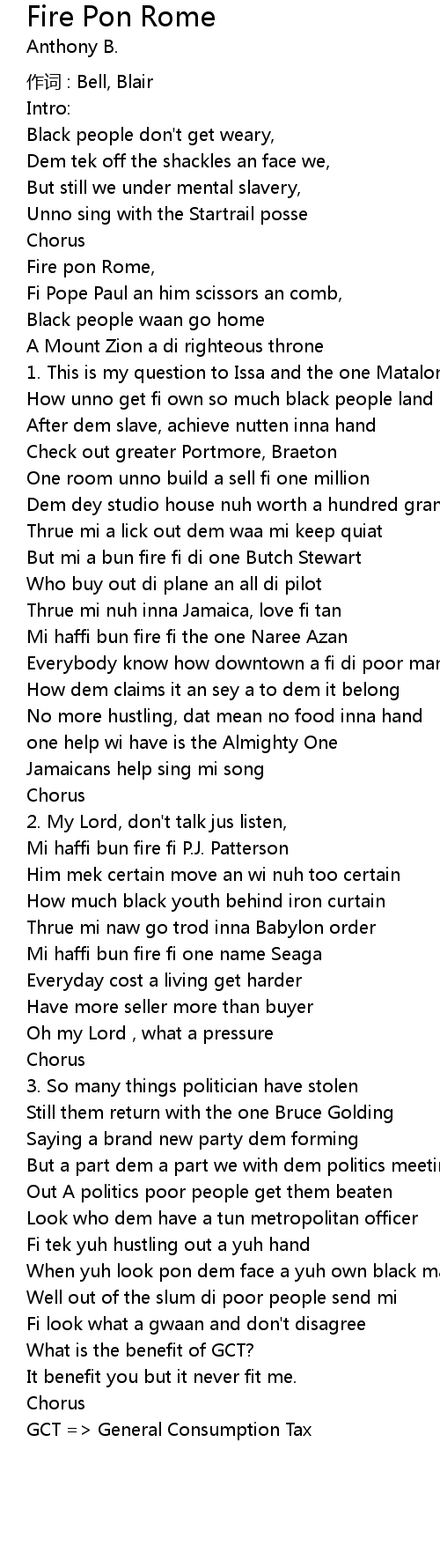 | Song | Fire Pon Rome |