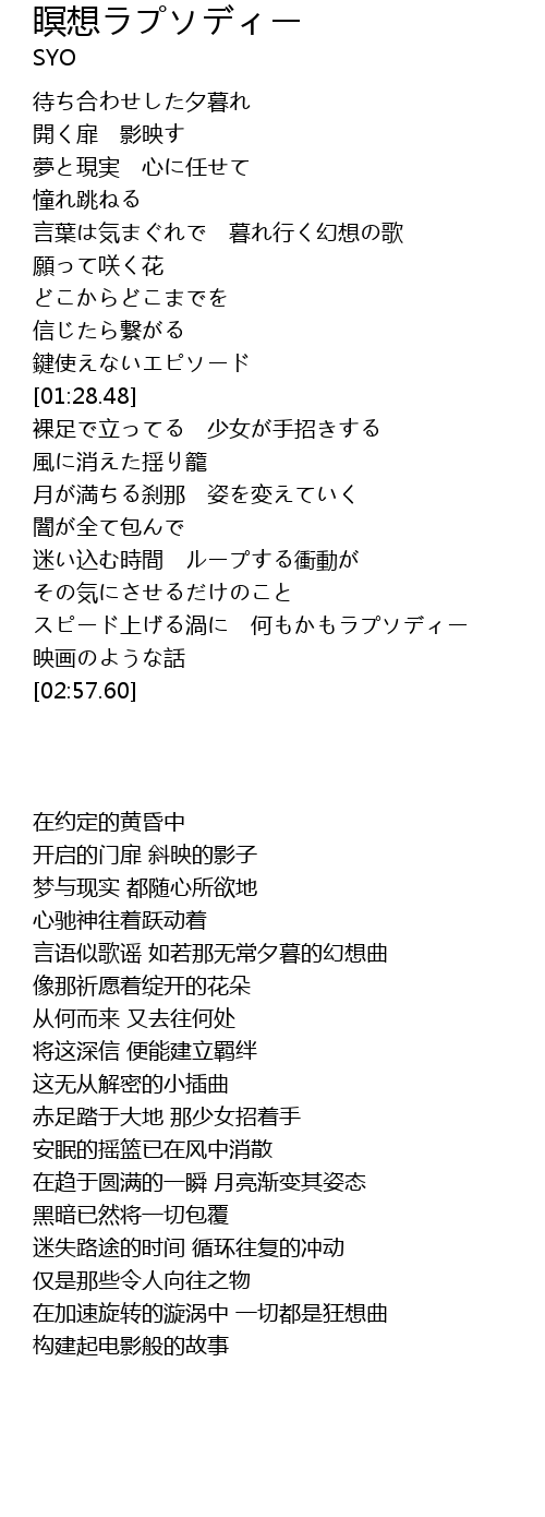 | [00:58.75] | 言葉は気まぐれで 暮れ行く幻想の歌 |
