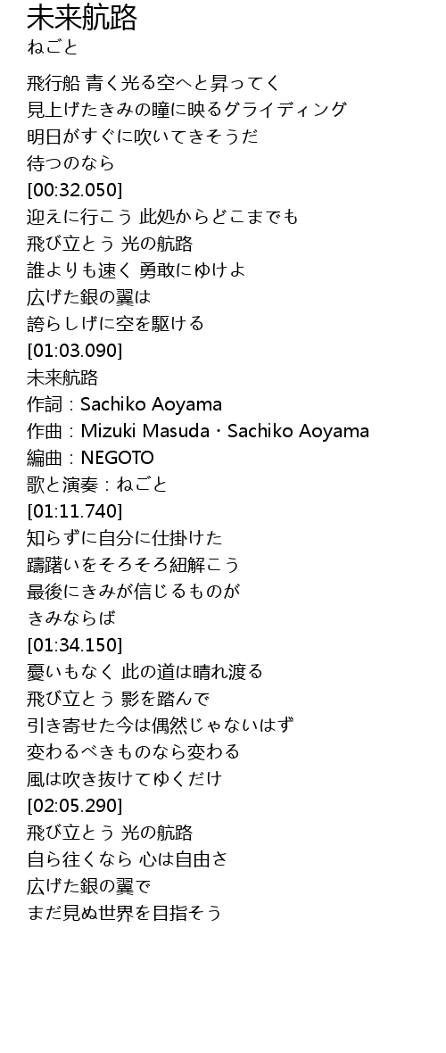 | [00:00.750] | 飛行船 青く光る空へと昇ってく |