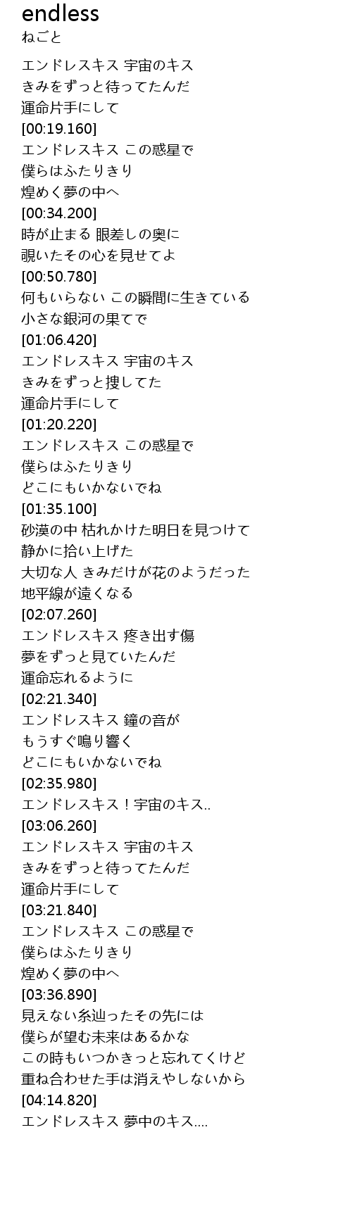 | [00:07.120] | エンドレスキス 宇宙のキス |