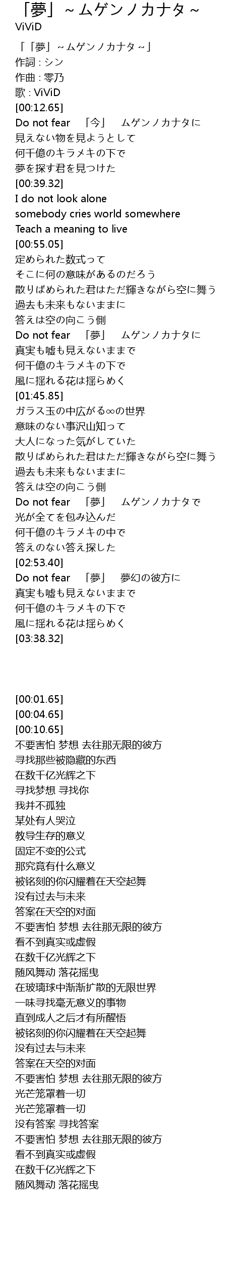 | [02:27.38] | Do not fear 「夢」 ムゲンノカナタで |