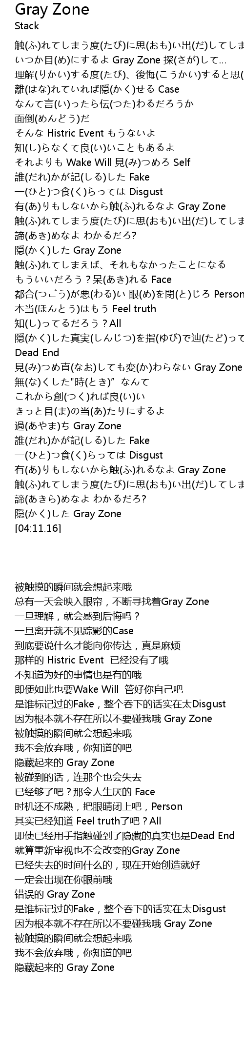 | [03:40.56] | 有(あ)りもしないから触(ふ)れるなよ Gray Zone |