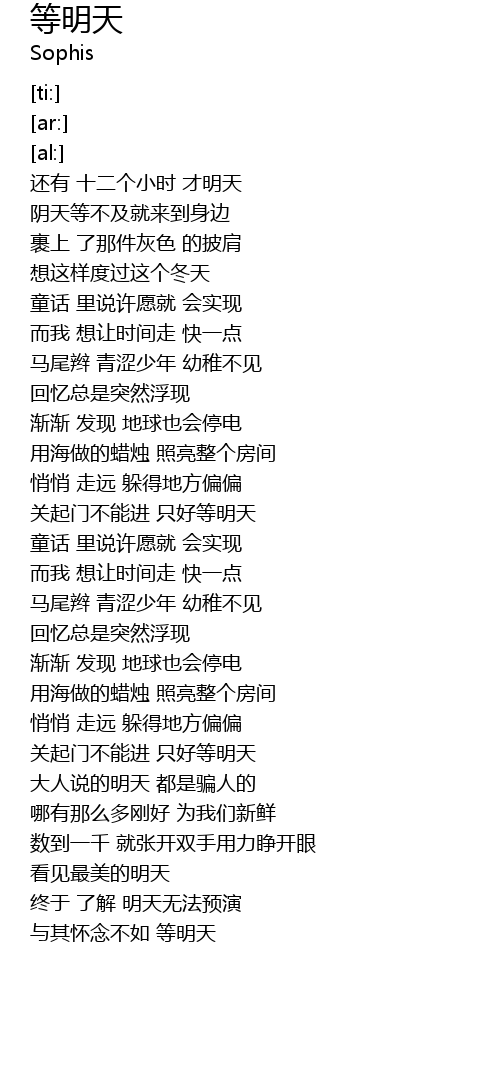 | [00:15.70] | 还有 十二个小时 才明天 |