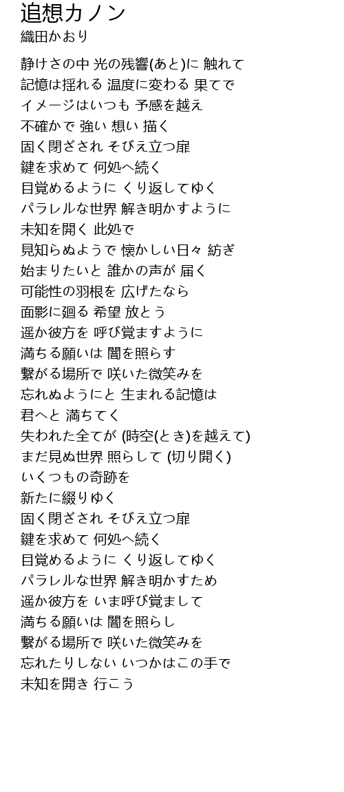 | [01:28.180] | 見知らぬようで 懐かしい日々 紡ぎ |