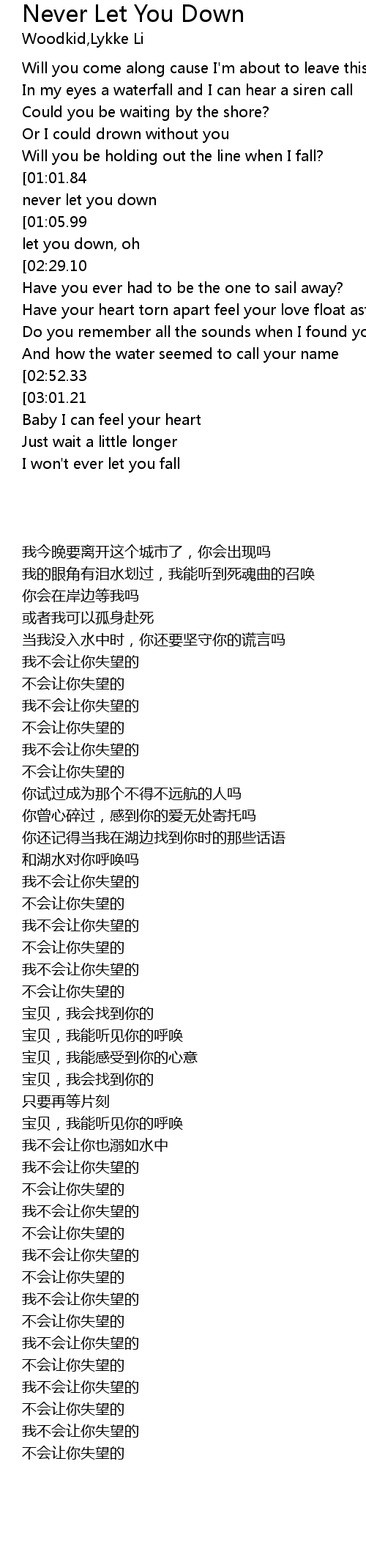 | [01:21.97][02:29.10][04:00.64][04:16.83] | Never let you down |