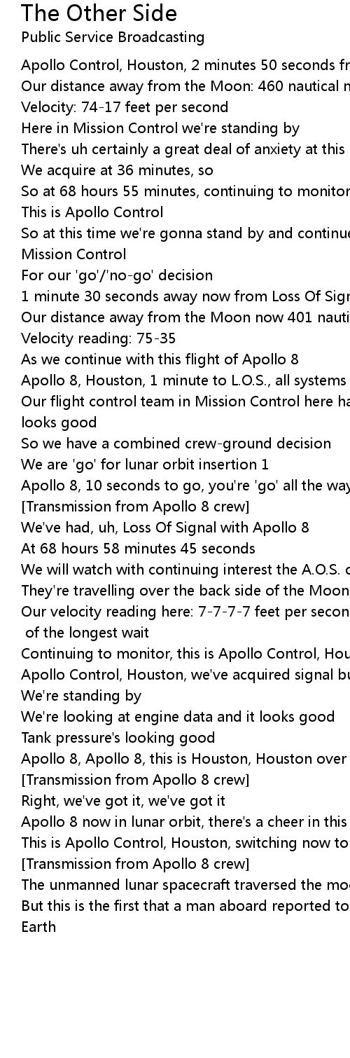 Apollo 8, Houston, 1 minute to L.O.S., all systems go |