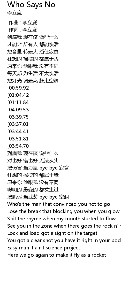 | [02:33.75][01:04.42] | No no no no no ta zai shuo ni zai shuo you ren shuo |