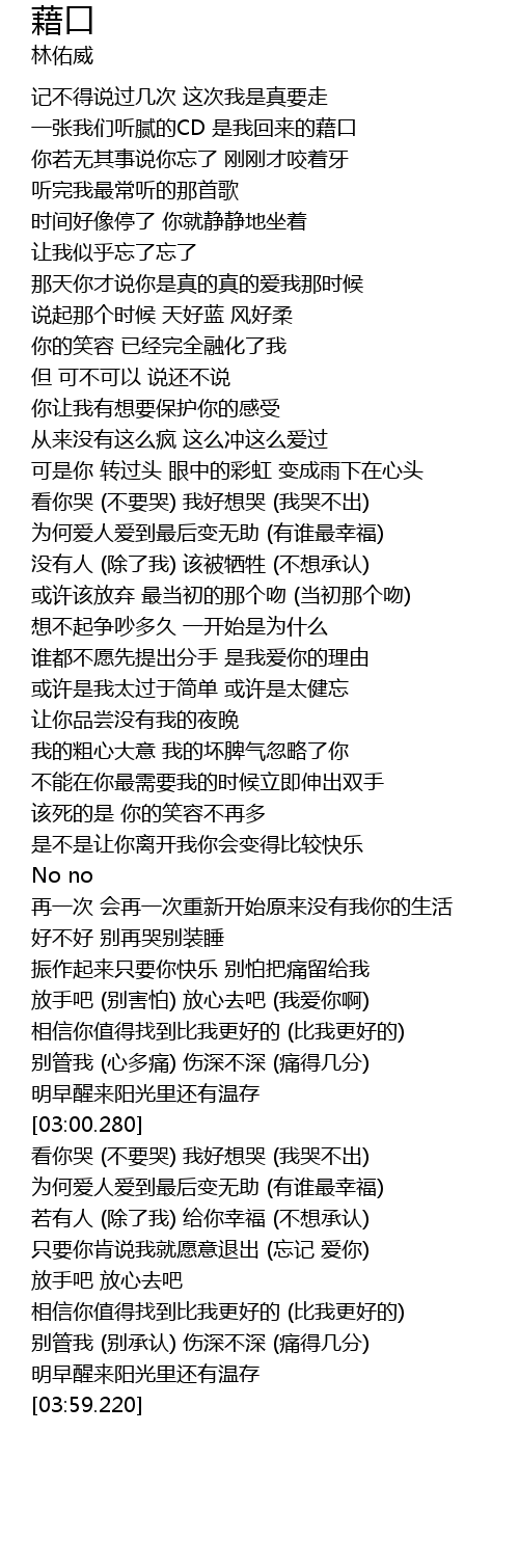 | [00:18.220] | 一张我们听腻的CD 是我回来的藉口 |
