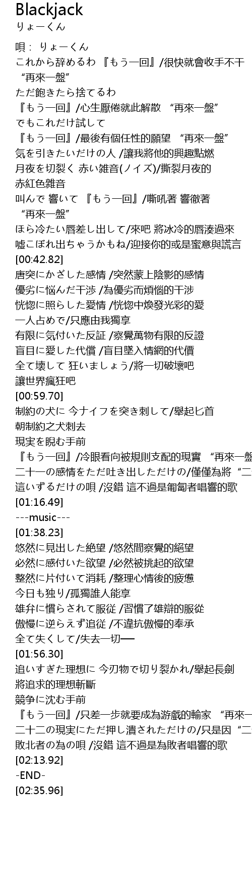 | [02:01.22] | 競争に沈む手前 『もう一回』/只差一步就要成為游戲的輸家 “再來一盤” |