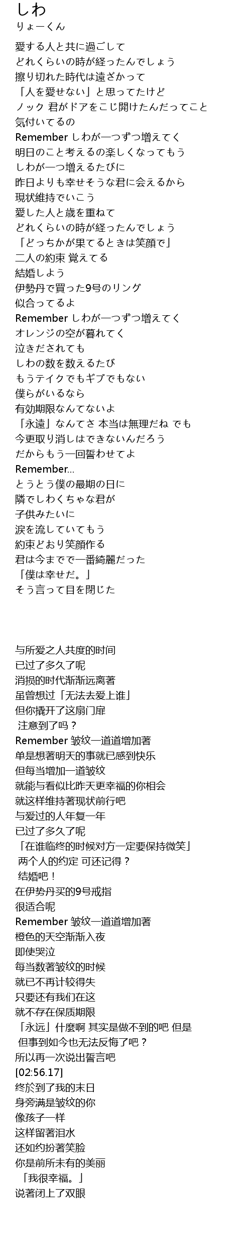 | [00:31.21] | Remember しわが一つずつ増えてく |