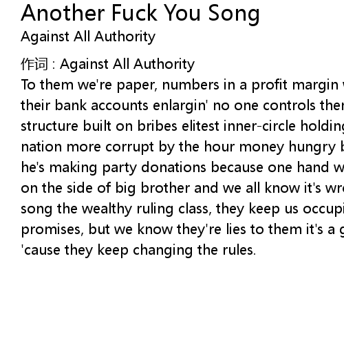 | To them we' re paper, numbers in a profit margin we fill their pockets keep their bank accounts enlargin' no one controls them, they' re on the inside of a structure built on bribes elitest innercircle holding decisive power over a nation more corrupt by the hour money hungry business man, he' s got a big plan he' s making party donations because one hand washes the other it' s safer to be on the side of big brother and we all know it' s wrong so here' s another fuck you song the wealthy ruling class, they keep us occupied they fill our heads with promises, but we know they' re lies to them it' s a game, and we will always lose ' cause they keep changing the rules. |