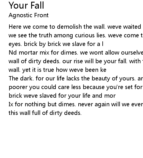 Here we come to demolish the wall. weve waited years to witness this fall. today we see the truth among curious lies. weve come to seek justice with our own eyes. brick by brick we slave for a l |