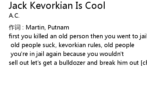 | first you killed an old person then you went to jail then you killed another when you got out on bail chorus: old people suck, kevorkian rules, old people suck, jack kevorkian' s cool i x2 you' re in jail again because you wouldn' t sell out let' s get a bulldozer and break him out chorus |