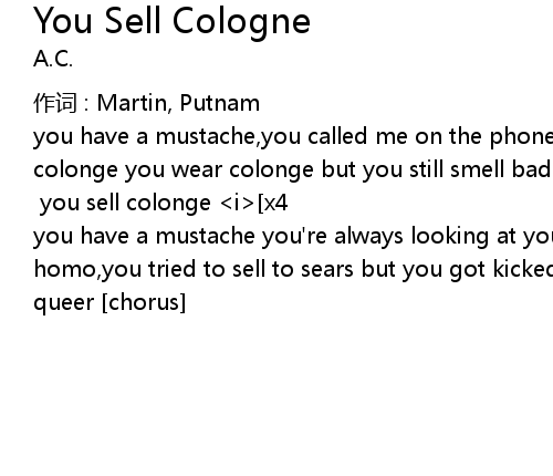 | you have a mustache,you called me on the phone you wear a beret and you sell colonge you wear colonge but you still smell bad you smell like shit from all the men that you've had [chorus:] you sell colonge <i>[x4] you wear a gay suit, you have a mustache you're always looking at your customers ass a freelance homo,you tried to sell to sears but you got kicked out because you're fucking queer [chorus] |