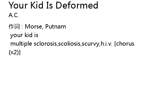 | clubbed foot,lazy eye,cleft pallet,webbed hands [chorus:] your kid is deformed,oi! oi! oi! <i>[x4] multiple sclorosis,scoliosis,scurvy,h.i.v. [chorus (x2)] |