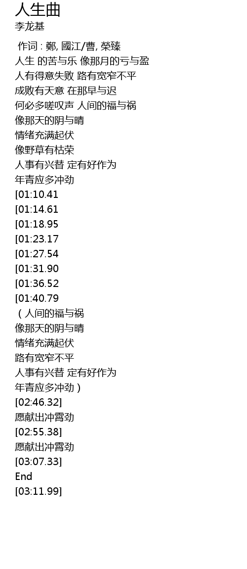 | [02:33.17][01:31.90] | 愿创出新的里程 |
