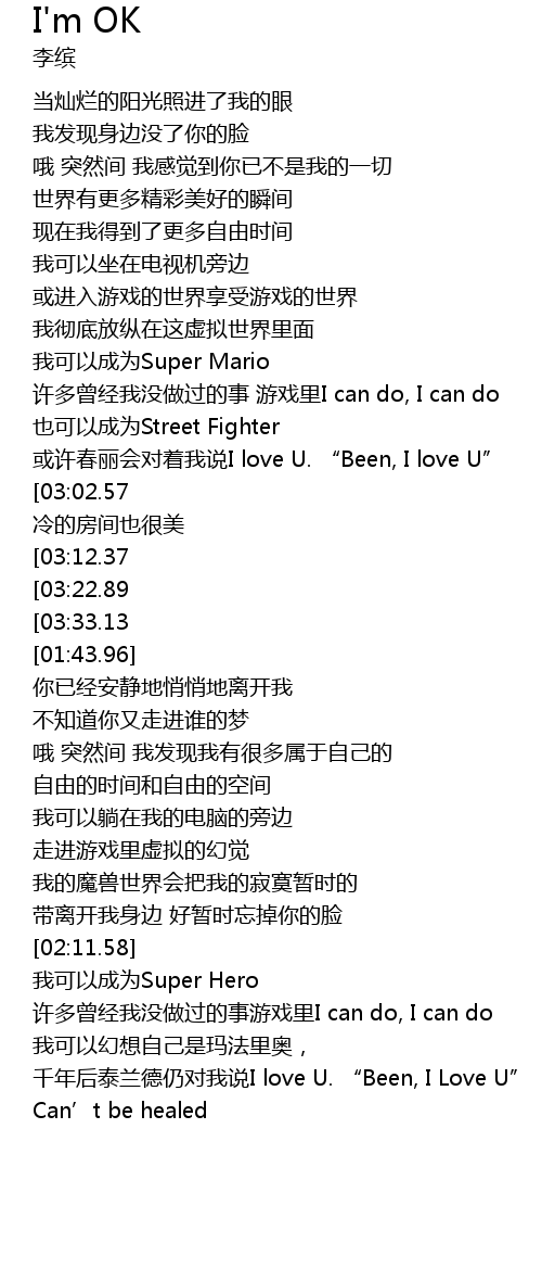 | [03:54.14][03:12.37][01:17.46] | I' m OK, méi yǒu nǐ wǒ qí shí wú suǒ wèi |
