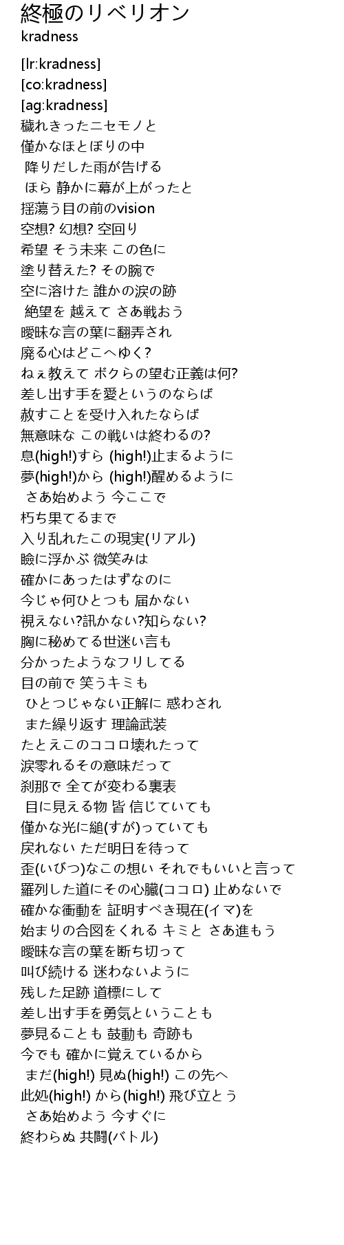 | [01:01.66] | 息(high!)すら (high!)止まるように |
