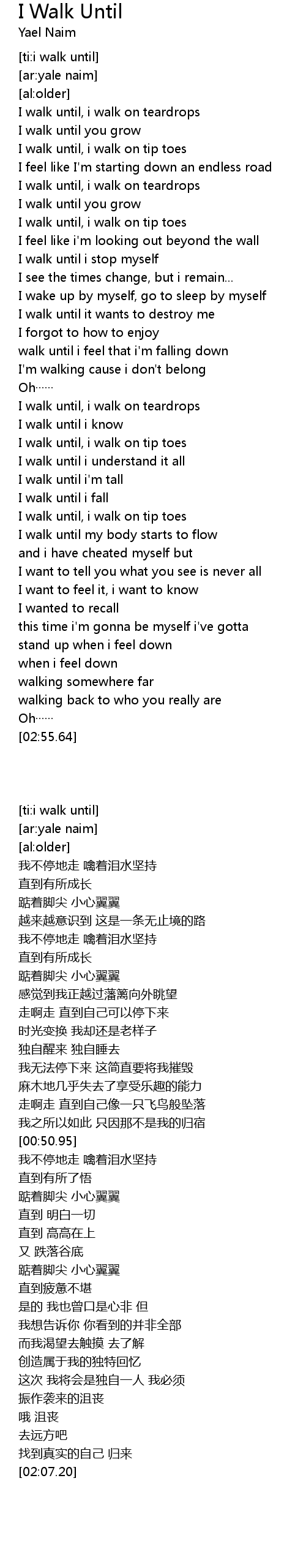 | [00:10.29] | I feel like I' m starting down an endless road |
