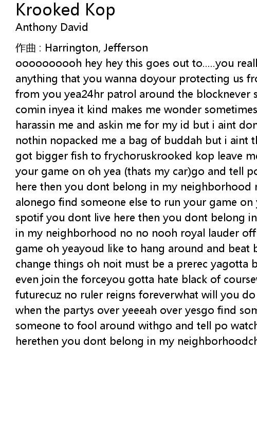 | oooooooooh hey hey this goes out to..... you really do think that you can do anything that you wanna doyour protecting us from crime butwhos protecting us from you yea24hr patrol around the blocknever stops the drugs from comin in comin inyea it kind makes me wonder sometimes just whos really deliverinalways harassin me and askin me for my id but i aint done nothin so you aint seein nothin nopacked me a bag of buddah but i aint the high school shootahim sure you got bigger fish to frychoruskrooked kop leave me alonego find someone else torun your game on oh yea thats my car go and tell po watchin my spotif you dont live here then you dont belong in my neighborhood nochoruskrooked kop leave me alonego find someone else to run your game on yeago and tell po watchin my spotif you dont live here then you dont belong in my neighborhoodyou dont belong in my neighborhood no no nooh royal lauder offraternity brothersis really just a game oh yeayoud like to hang around and beat brothers downbut you dont wanna change things oh noit must be a prerec yagotta be on a power trailfor you to even join the forceyou gotta hate black of coursewont be that way in the futurecuz no ruler reigns foreverwhat will you do whenits over watcha gonna do when the partys over yeeeah over yesgo find someone to run your game ongo find someone to fool around withgo and tell po watchin my spotif you dont live herethen you dont belong in my neighborhoodchorus |