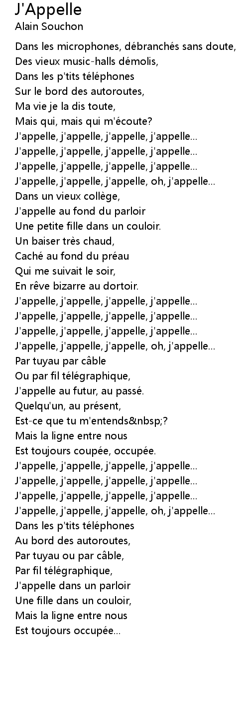 | J' appelle, j' appelle, j' appelle, oh, j' appelle... | |