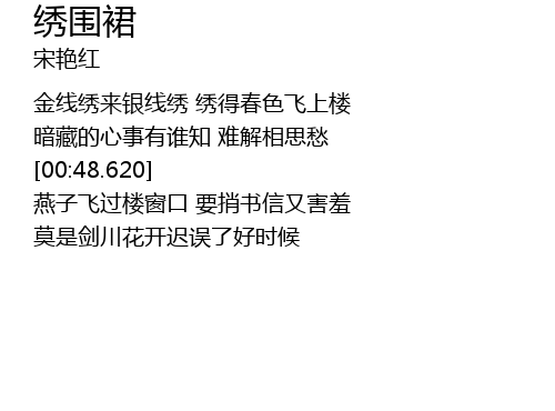 | [00:17.780] | 金线绣来银线绣 绣得春色飞上楼 |