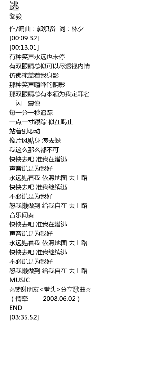 | [02:51.69] | 快快去吧 准我继续逃 |