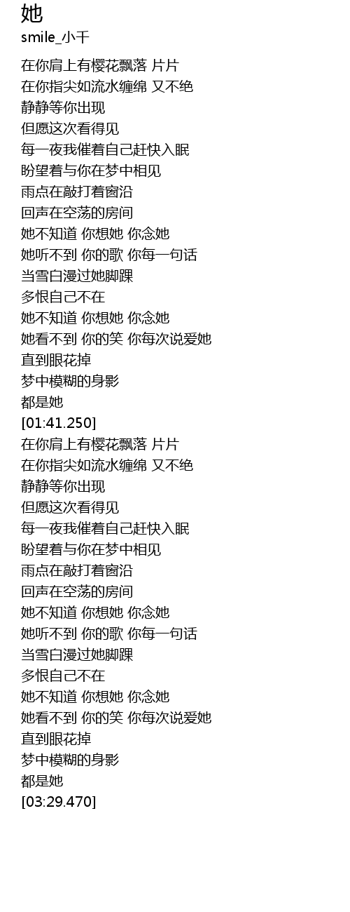 | [01:18.420] | 她看不到 你的笑 你每次说爱她 |