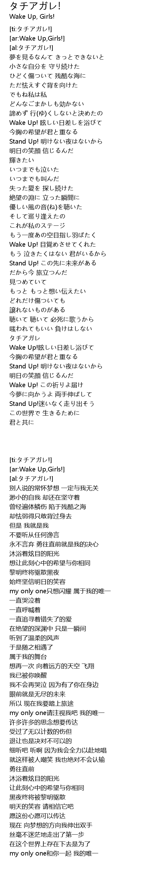 | [04:15.690] | Stand Up! mí zǒu chū |