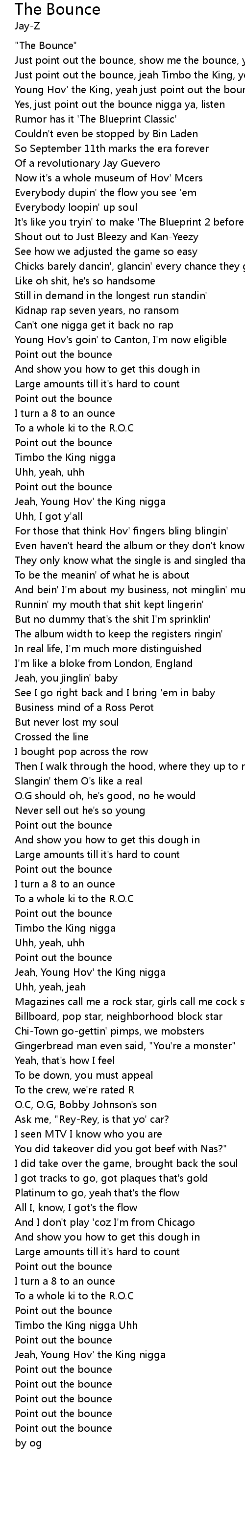 | [00:10.55] | Young Hov' the King, yeah just point out the bounce |