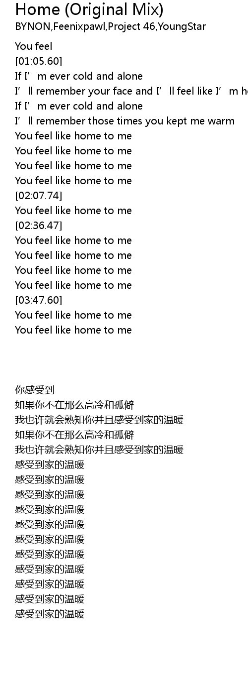 | [01:16.34] | I’ll remember your face and I’ll feel like I’m home |