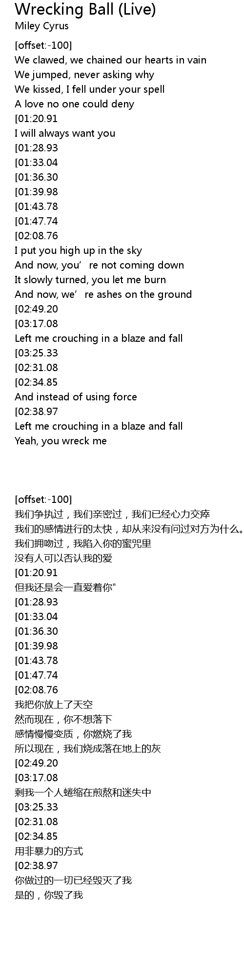 | [00:44.02][01:36.30][01:52.22][02:57.28][03:13.36] | I came in like a wrecking ball |