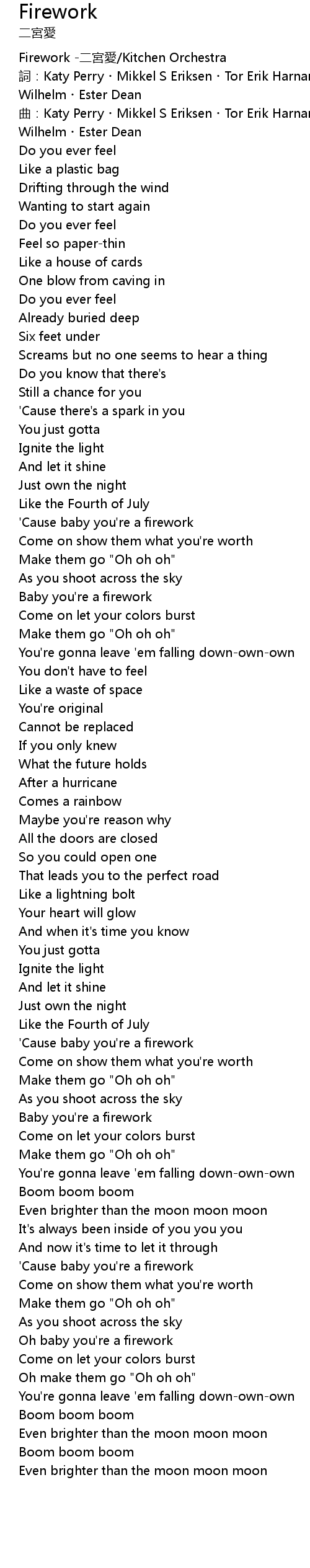 | [00:00.507] | Firework -二宮愛/Kitchen Orchestra |