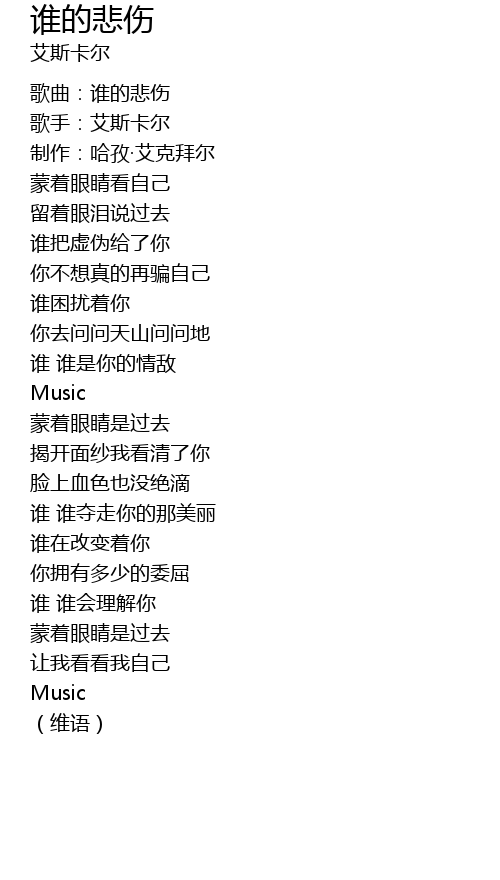 | [00:03.874] | gē qǔ: shuí de bēi shāng |