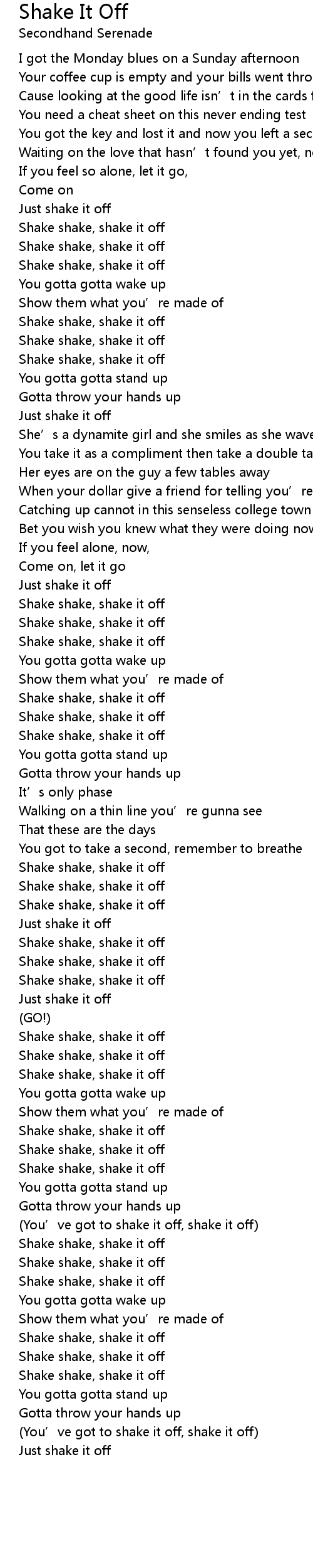 | You' ve got to shake it off, shake it off | |