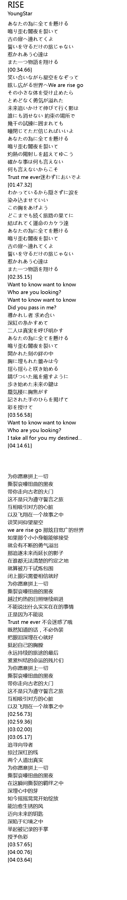 | [00:43.69] | 眩し広がる世界へWe are rise go |