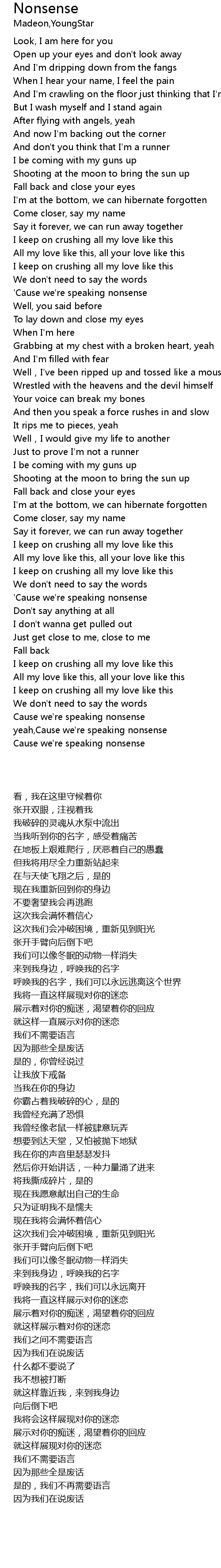 | [02:22.87] | ' Cause we' re speaking nonsense |
