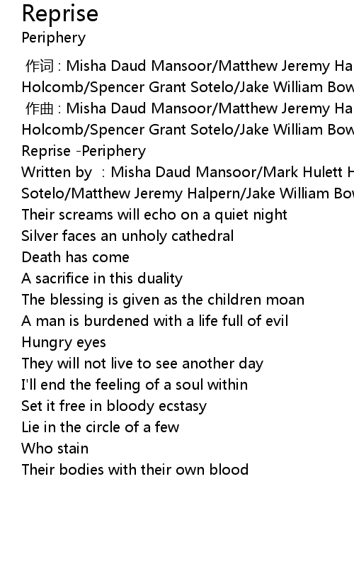 | [00:00.576] | Written by :Misha Daud Mansoor/Mark Hulett Holcomb/Spencer Grant Sotelo/Matthew Jeremy Halpern/Jake William Bowen/Adam Getgood/Periphery |