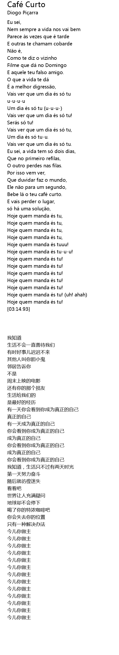 | [03:11.91] | Hoje quem manda é s tu! |